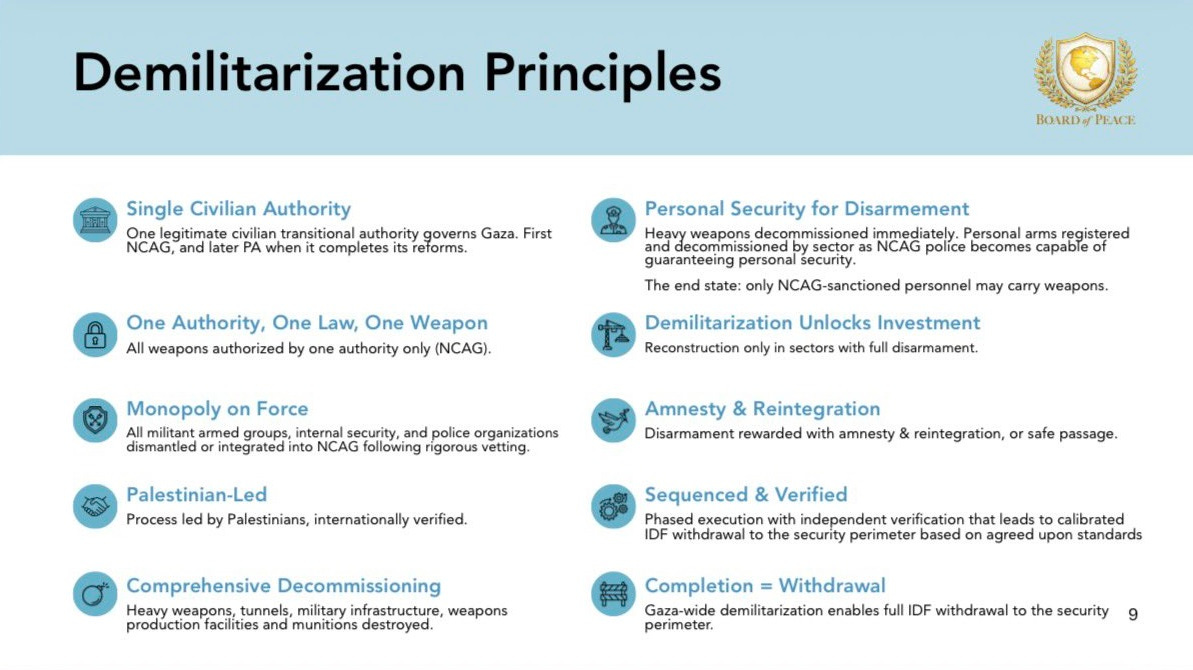 Reconstruction, according to the plan, will only take place in sectors that are fully disarmed, and those who agree to disarm will be given amnesty and reintegration into or safe passage out of Gaza.